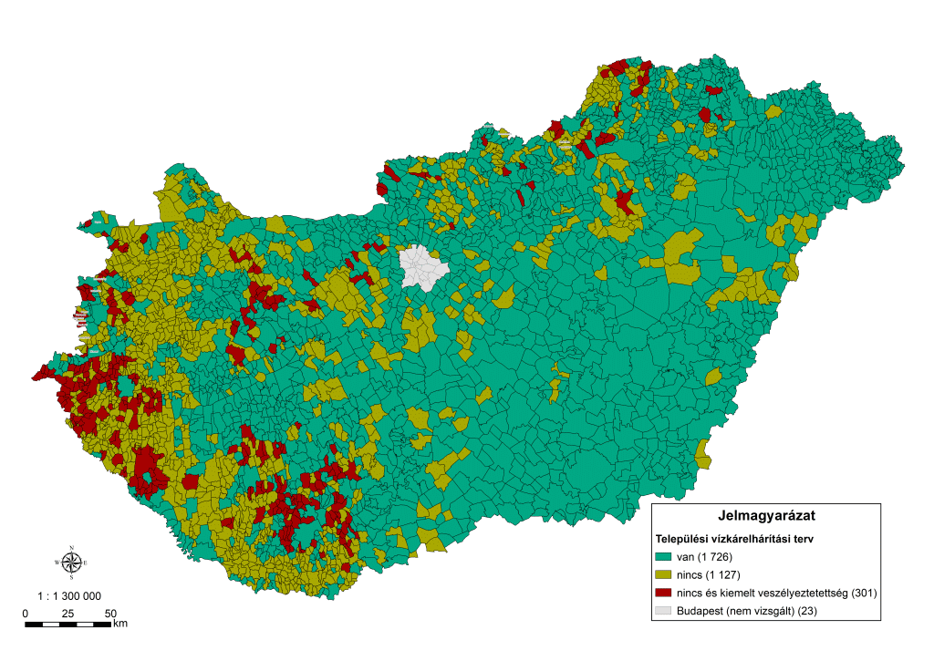 1. ábra. A vízkárelhárítási tervvel rendelkező települések eloszlása országos szinten. Külön kiemelve azon települések, melyek villámárvíz szempontjából kiemelten veszélyeztetettek, ám nem rendelkeznek vízkárelhárítási tervvel (2023-as adatok alapján).
