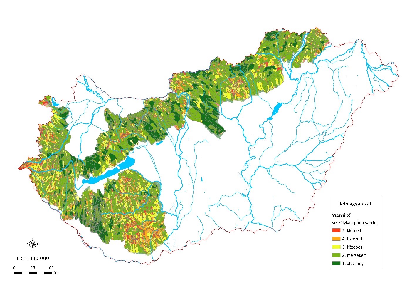 2. ábra. Magyarország dombvidéki vízgyűjtő területei villámárvíz kockázatának szempontjából.