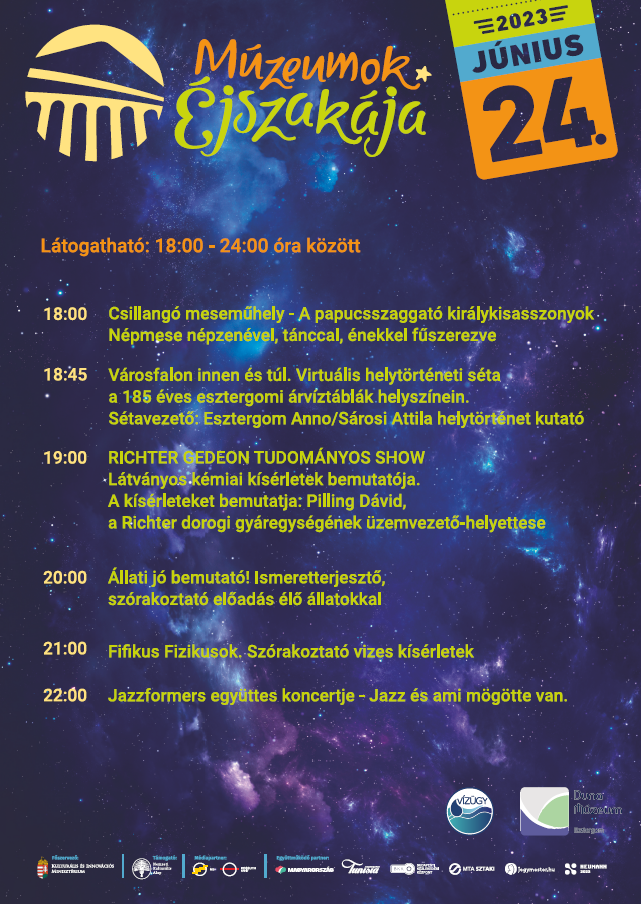 2023. június 24-én, Szent Iván éjjelén rendezik meg az ország egyik legnépszerűbb kulturális rendezvényét, a Múzeumok Éjszakáját. Esztergomban városi összefogással több kiállítóhely és gyűjtemény készül arra, hogy felejthetetlenné tegyék ezt a varázslatos nyárestét. A Duna Múzeum zenés meseelőadással, alkotósarokkal, ismeretterjesztő állatbemutatóval, virtuális helytörténeti sétával, látványos vizes és kémiai kísérletekkel, fröccsterasszal és koncerttel várja új és visszatérő látogatóit.